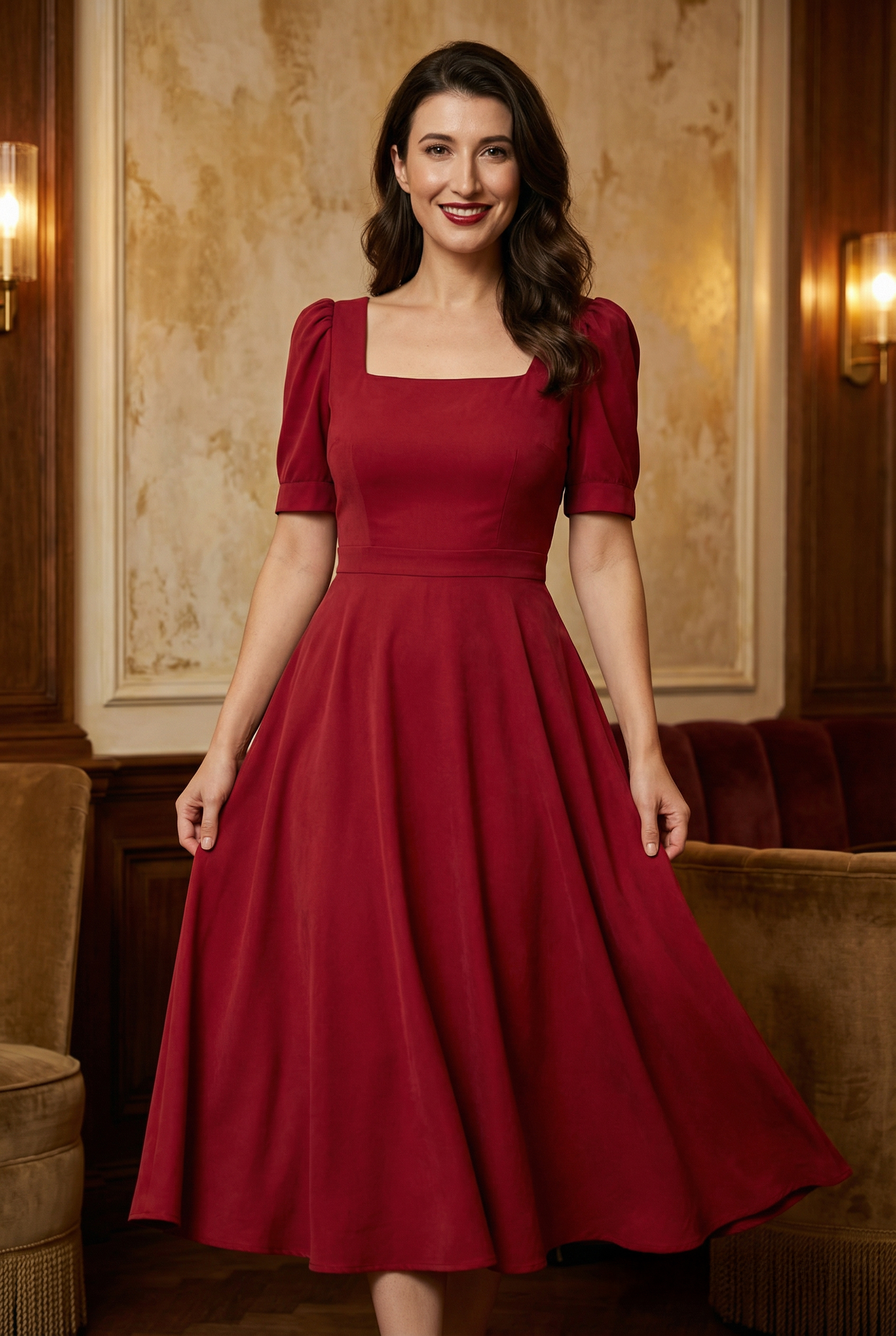 Bathed in a deep crimson hue, this dress captures the quiet magic of evening light. Designed with a sculpted square neckline and softly structured puff sleeves, it balances classic femininity with modern grace. The fitted bodice flows into a fluid, fit-and-flare silhouette, creating effortless movement with every step.