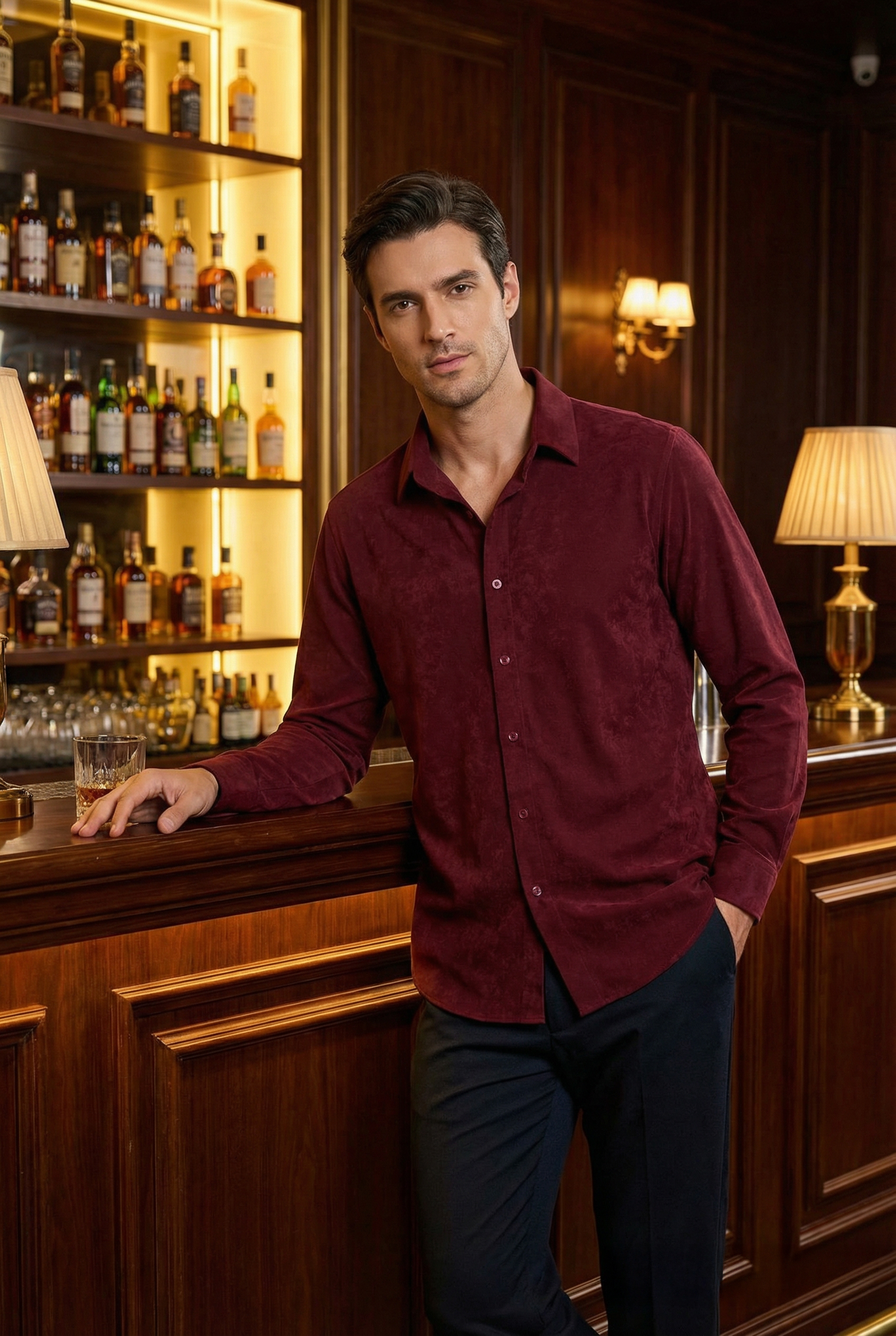 Description : Deep, warm, and effortlessly confident, the Bordeaux Ember Shirt is crafted for nights that linger. Rendered in a rich wine hue with a soft, velvety finish, this shirt captures the glow of low lights and late conversations.
