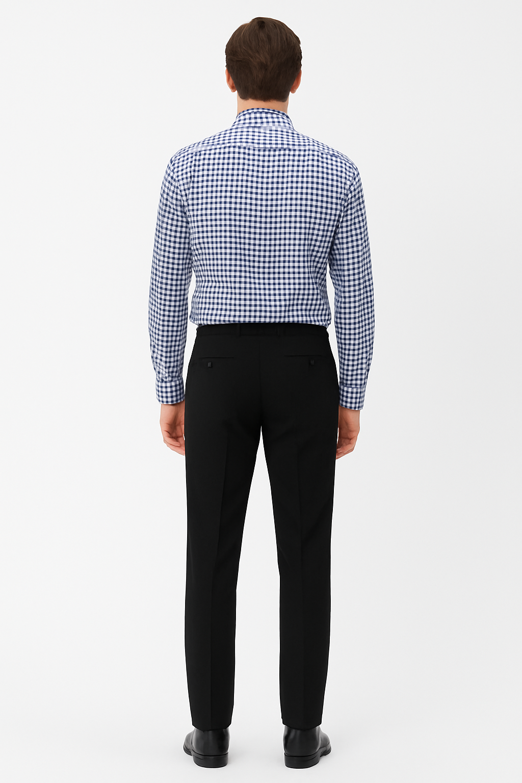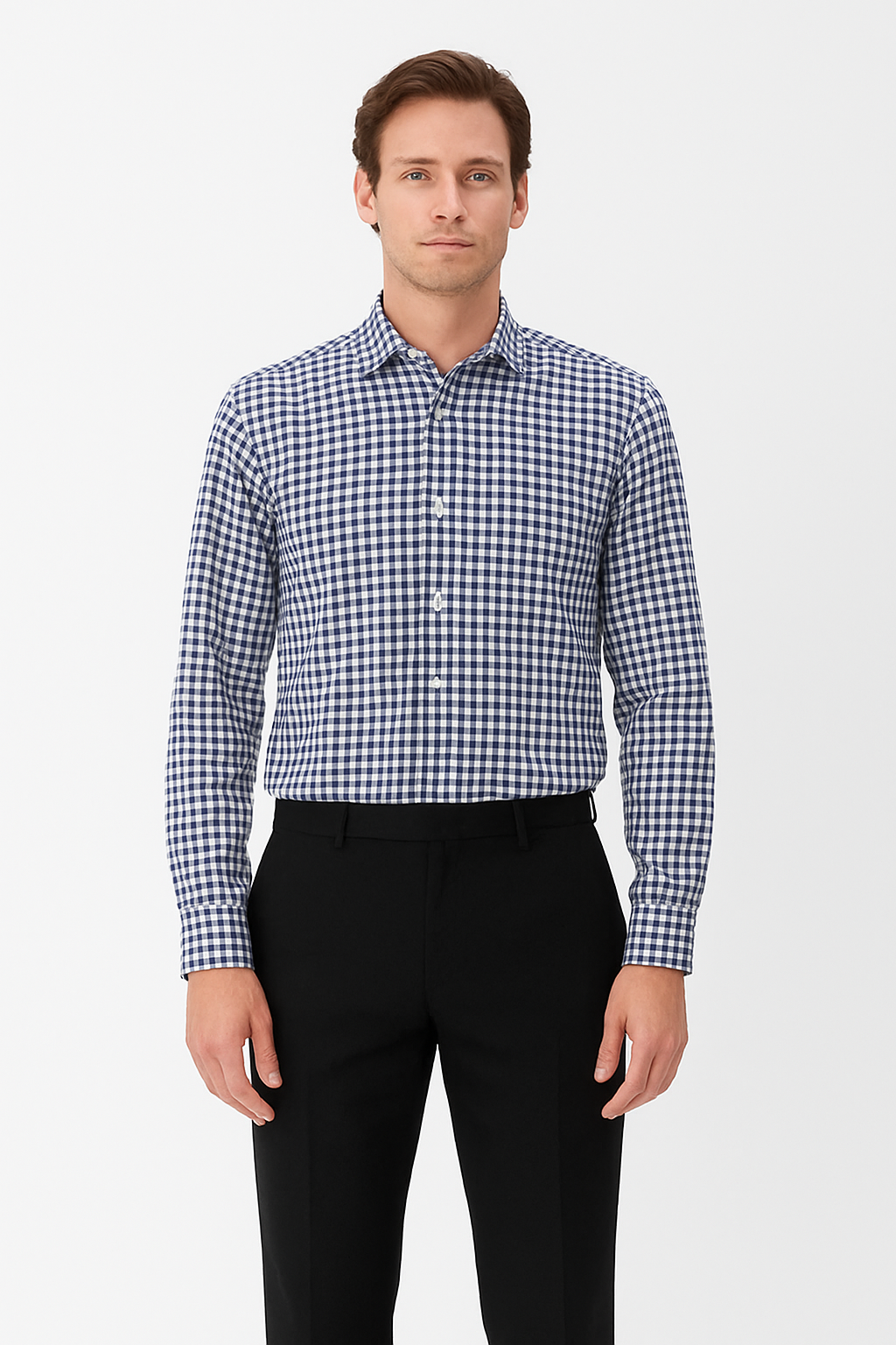 Description : Elevate your everyday style with this Classic Navy Gingham Check Shirt, crafted from premium cotton for all-day comfort and breathability. Designed in a relaxed slim fit with a regular collar and full sleeves, this timeless pattern blends modern sophistication with a casual edge. Perfect for both office wear and weekend outings, it pairs effortlessly with chinos or tailored trousers for a polished look.