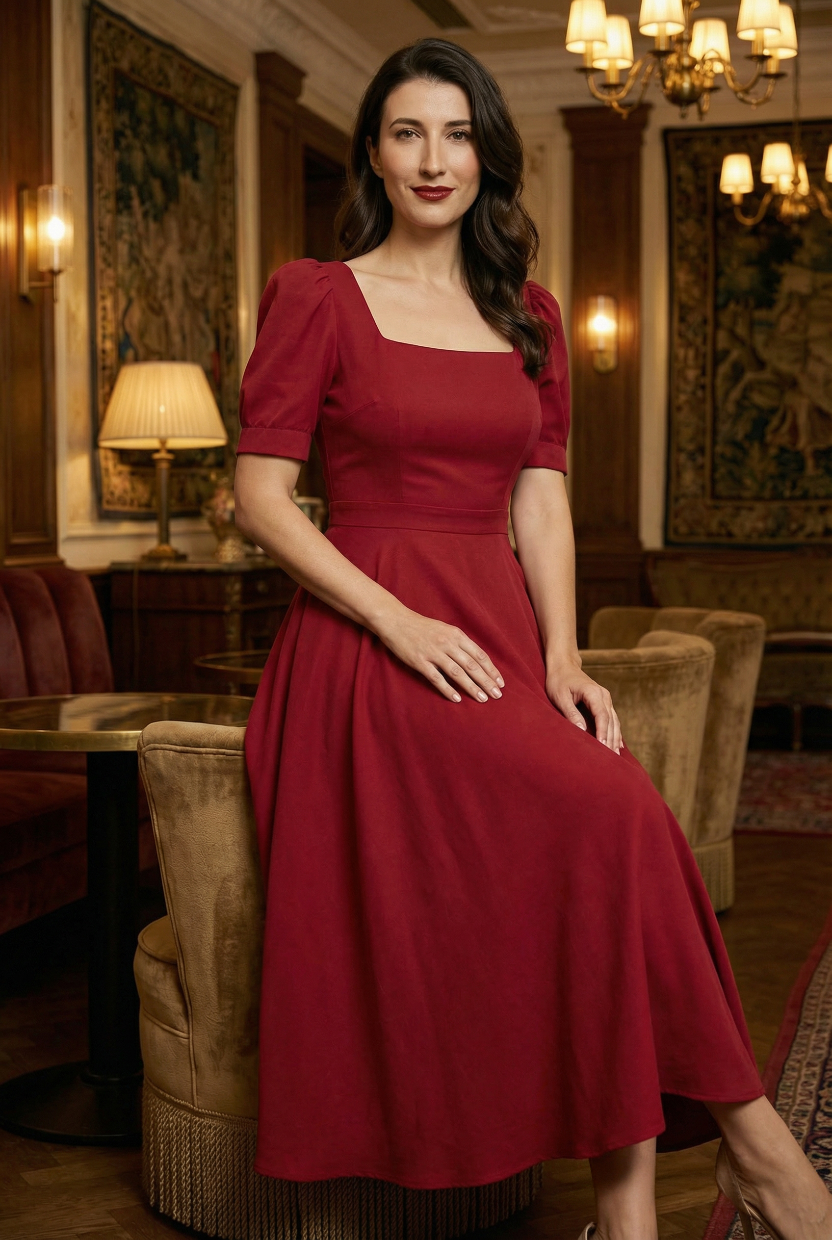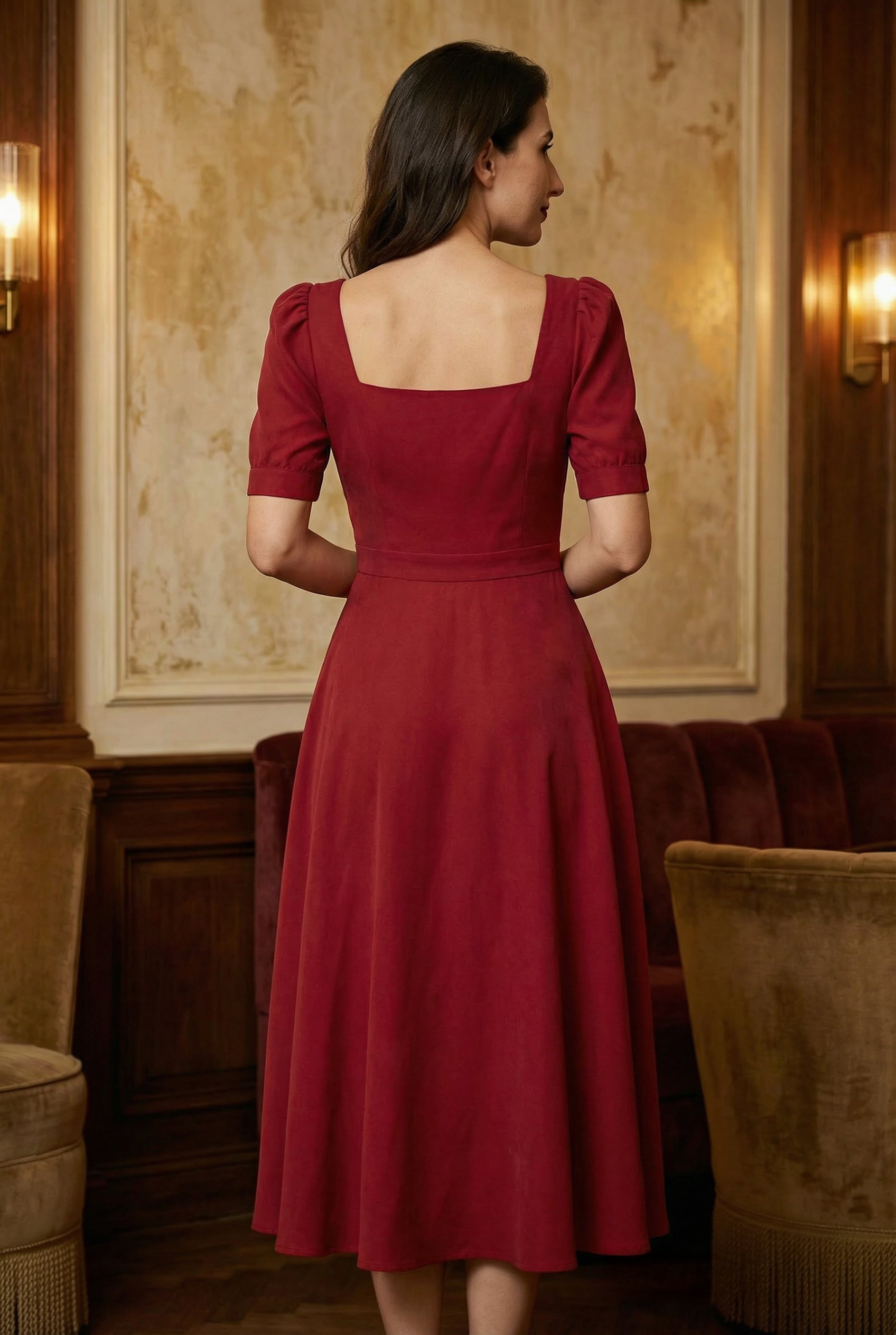Bathed in a deep crimson hue, this dress captures the quiet magic of evening light. Designed with a sculpted square neckline and softly structured puff sleeves, it balances classic femininity with modern grace. The fitted bodice flows into a fluid, fit-and-flare silhouette, creating effortless movement with every step.