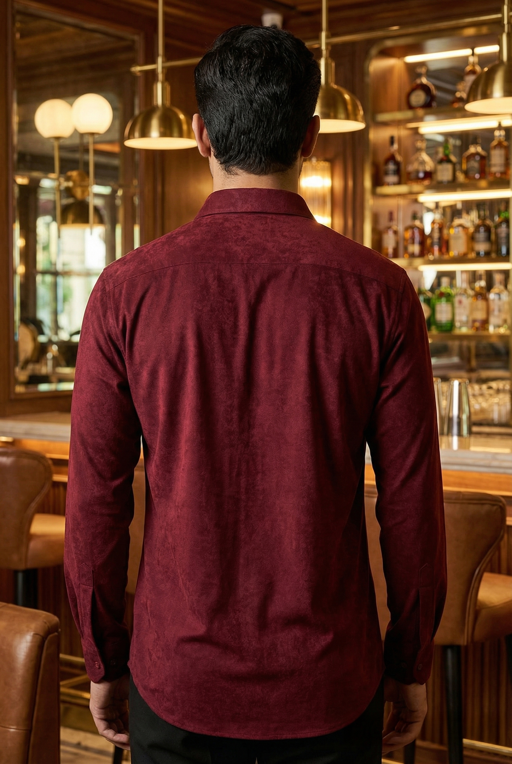Description : Deep, warm, and effortlessly confident, the Bordeaux Ember Shirt is crafted for nights that linger. Rendered in a rich wine hue with a soft, velvety finish, this shirt captures the glow of low lights and late conversations.